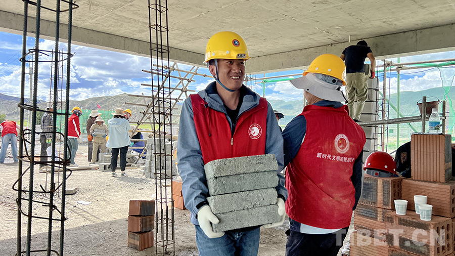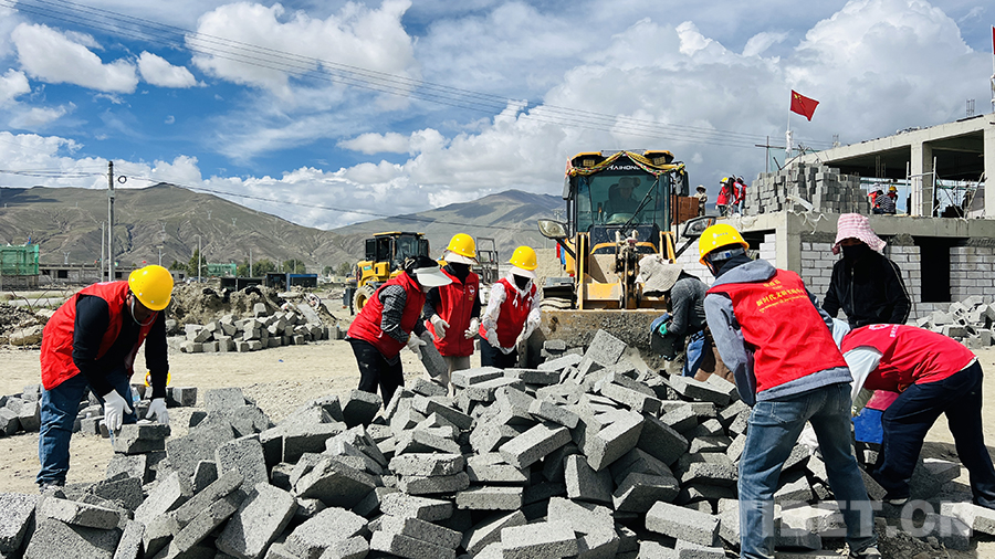 图为拉孜县曲下镇土林村施工现场,干部职工和当地村民一起搬砖
