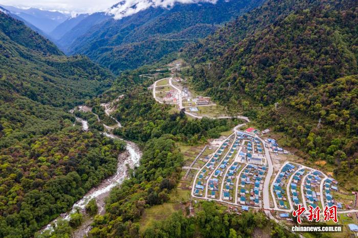 资料图为2021年5月16日,航拍西藏墨脱县扎墨公路沿线的贡日村,该村为旧扎墨公路80K处,是一处物资转运点。江飞波 摄
