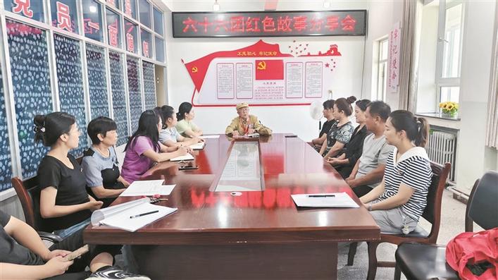 在四师六十六团举办的红色故事分享会上,老战士宣讲团成员闫欣秋为职工群众讲述兵团故事(摄于7月17日)。 兵团日报常驻记者 李惠 通讯员 武淑洋 摄