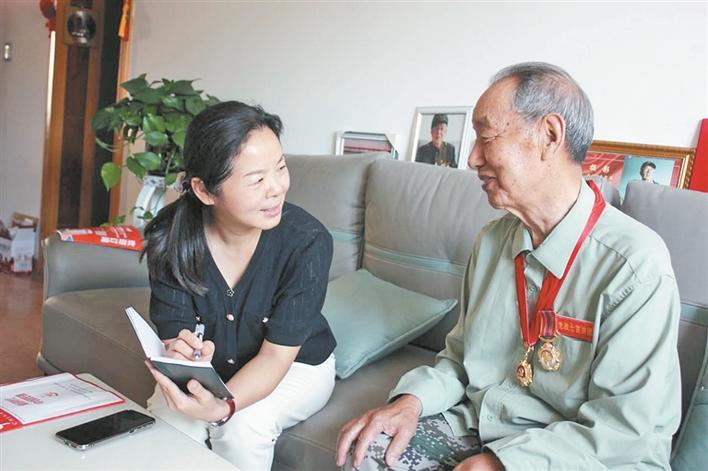 四师可克达拉市融媒体中心记者在采访四师六十六团老战士宣讲团成员赵文秋(右)(摄于8月20日)。闫欣秋 摄