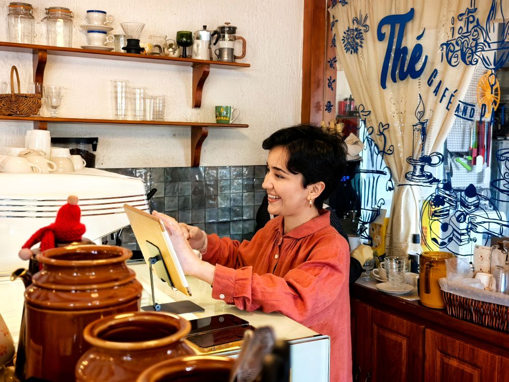 9月18日,乌鲁木齐市“一个咖啡店”老板耐菲丝·地力夏提在为顾客点单。新华社记者 贺小童 摄