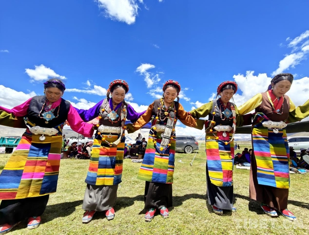 图为扎果村妇女载歌载舞,欢庆乔迁之喜与望果节的双重喜悦