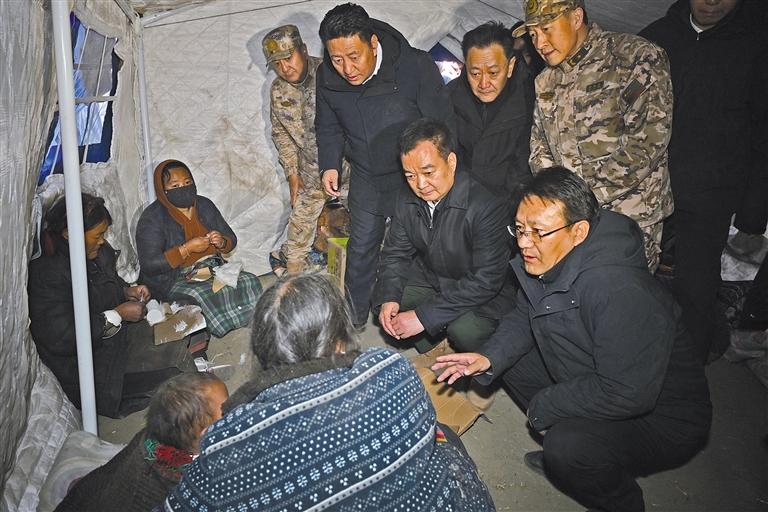 每到一处,王君正都向群众转达习近平总书记和党中央、中央领导同志的关心关怀,告诉群众相信有习近平总书记的关心关怀,我们就没有克服不了的困难。当受灾群众听到习近平总书记和中央领导同志的关心关怀,大家十分激动,许多群众流下了感动的泪水,对抗震救灾、重建家园燃起了信心。“我们就是担心老人孩子晚上受冻感冒。”当听到灾区群众的担心时,王君正说:“你们的担心正是我们的担心。”天灾无情、人有情。在安置点上,王君正鼓励受灾群众坚定信心,党和政府一定会全力以赴开展抗震救灾,大家要团结一心、互帮互助,克服暂时的困难,加强统一规划、重建新家园,齐心协力共建社会主义新农村。晚上六点三十分许,海拔4400米的安置点上寒风凛冽,看见已有帐篷陆陆续续搭建起来,王君正叮嘱受灾群众赶紧到帐篷里取暖,不要受凉受冻。他要求相关部门,要深刻认识灾区地处高海拔区域的特殊情况,把受灾群众御寒保暖工作摆在更加突出位置,加紧调集棉帐篷、棉衣、棉被、烤火炉等物资,加快帐篷安装进度,确保受灾群众吃上热饭、喝上热水、住上帐篷、温暖过夜、感受亲情。要严防发生次生灾害,全面排查房屋受损情况,对严重受损的建筑严格管控,强化巡查值守,做好安全防范工作,严防火灾,抓好卫生防疫,配备预防流感等药物,加强食品和饮用水卫生监管,坚决维护灾区社会稳定。要充分发挥基层党组织战斗堡垒作用和党员先锋模范作用,落实落细党中央和自治区抗震救灾各项安排部署,主动同受灾群众吃住在一起,用心用情解决困难,引导受灾群众开展自救、互帮互助,让党旗在抗震救灾一线高高飘扬。党政军警民要协调联动,解放军、武警、消防、边检和地方各救援力量要统一指挥、统一调度、加强协同、密切合作,齐心协力抓好抗震救灾工作。