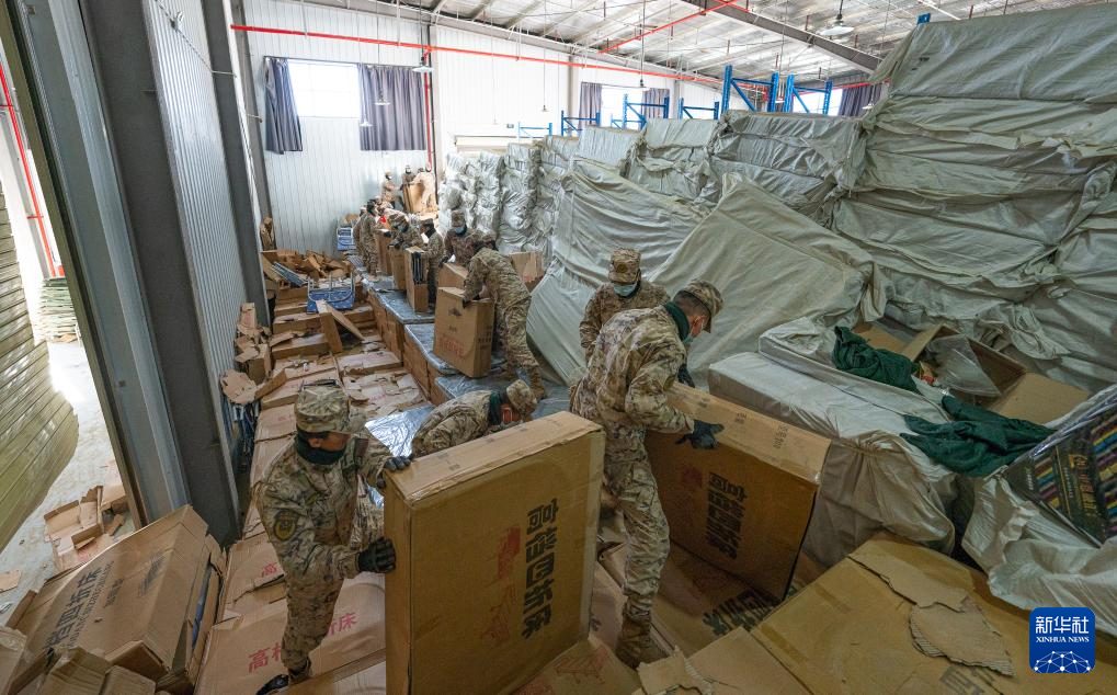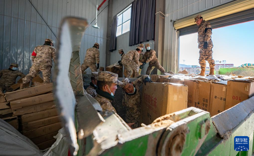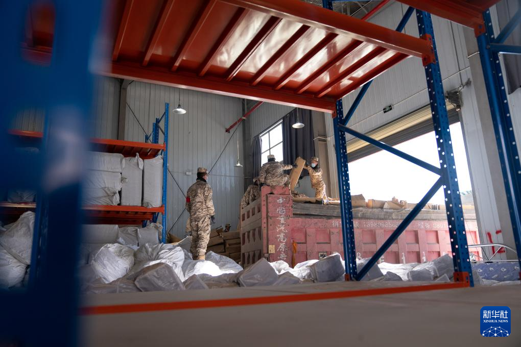 1月8日,在日喀则市经开区物资储备仓库,武警官兵在搬运抗震救灾物资。新华社记者 丁增尼达 摄