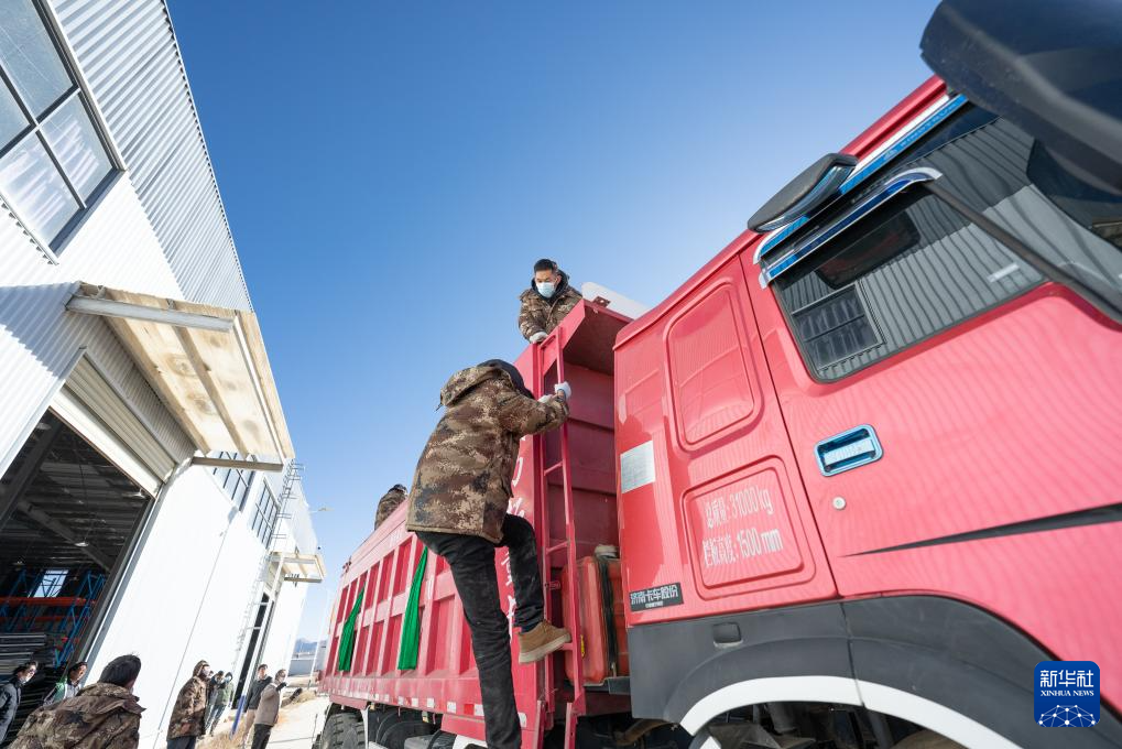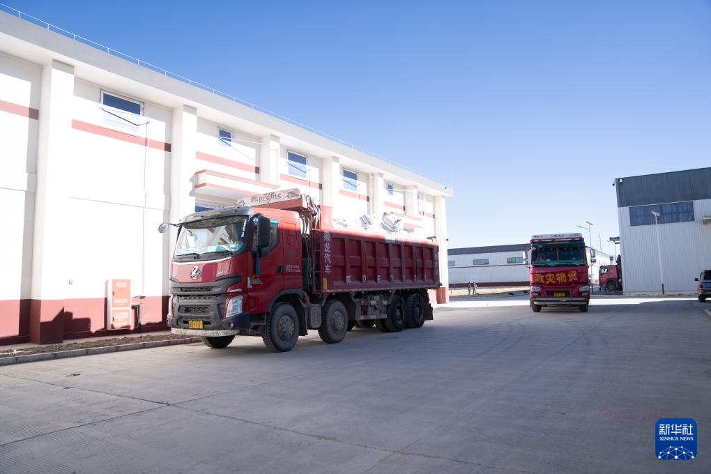1月8日,在日喀则市经开区物资储备仓库,装好抗震救灾物资的车辆驶出园区。新华社记者 丁增尼达 摄