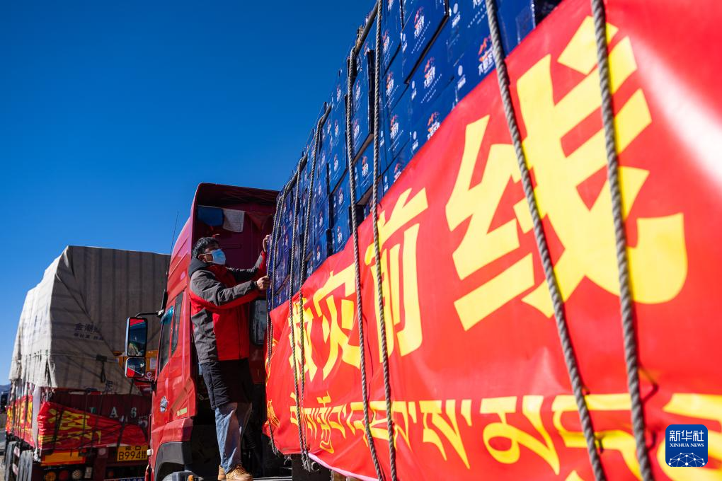 1月8日,在日喀则市境内的318国道旁,当地企业工作人员在用绳子固定抗震救灾物资。新华社记者 丁增尼达 摄