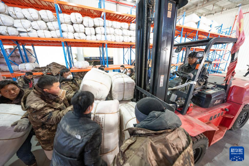 1月8日,在日喀则市经开区物资储备仓库,当地干部群众搬运抗震救灾物资。新华社记者 丁增尼达 摄