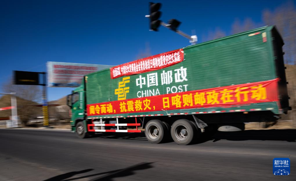 1月8日,在日喀则市境内的318国道旁,中国邮政的抗震救灾物资运输车辆向震中方向驶去。新华社记者 丁增尼达 摄
