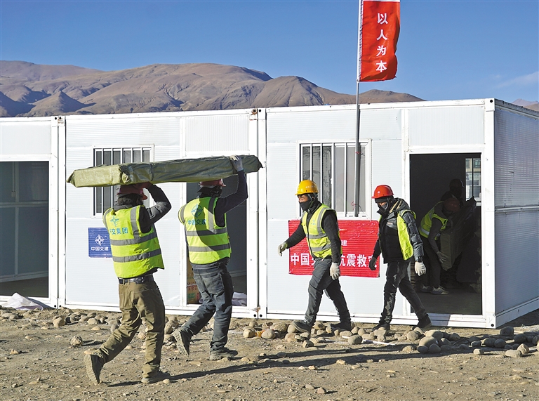 图为1月10日,中交集团二航局二公司工作人员在拉孜县为受灾群众组装活动板房。记者 薛莹 王香香 索朗群培 摄