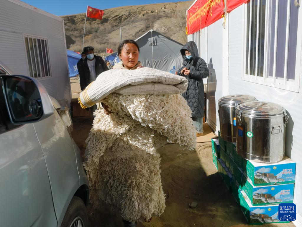 1月10日,在定日县长所乡古荣村,受灾群众将领取到的过冬物资搬入板房。新华社记者 沈伯韩 摄