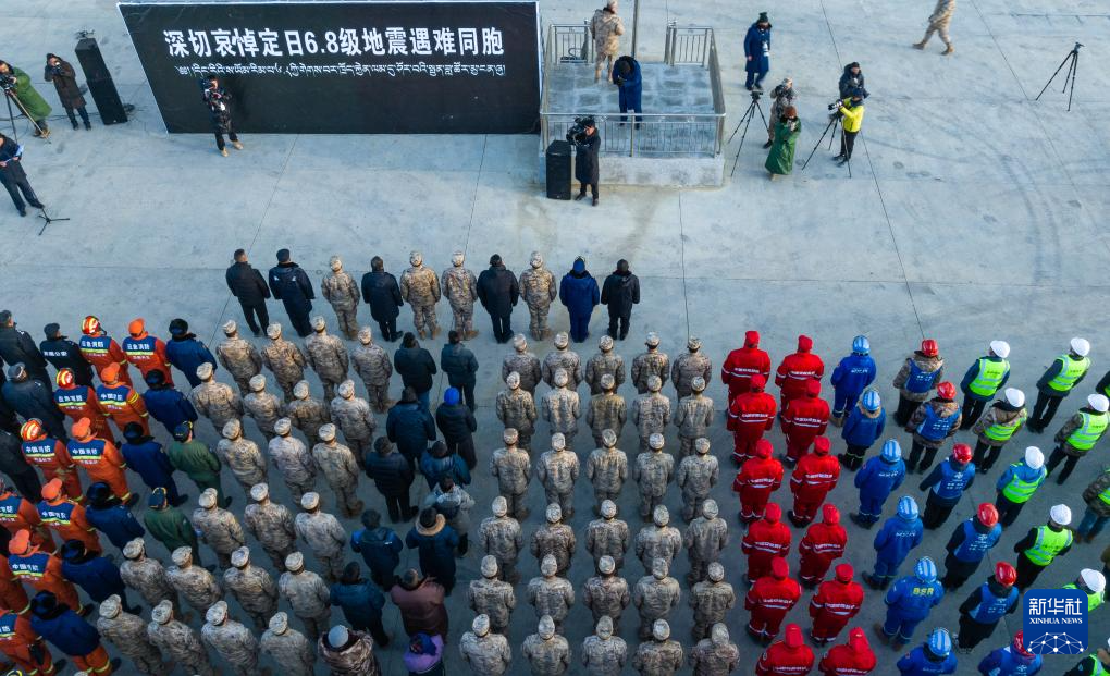 1月13日上午9时30分,西藏定日6.8级地震遇难同胞悼念仪式在受灾最严重的长所乡举行。参与救援的解放军和武警官兵、消防救援人员、公安民警、医护人员、青年志愿者及有关企业员工、干部职工、震区群众代表数百人,脱帽肃立,向遇难同胞默哀3分钟。新华社记者 丁增尼达 摄