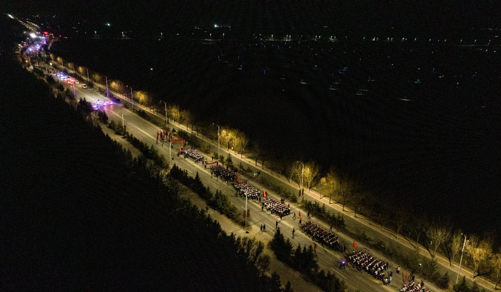 4月3日凌晨,参加徒步祭英烈活动的师生从固原市城区出发,前往位于彭阳县的任山河烈士陵园祭奠英烈(无人机照片)。