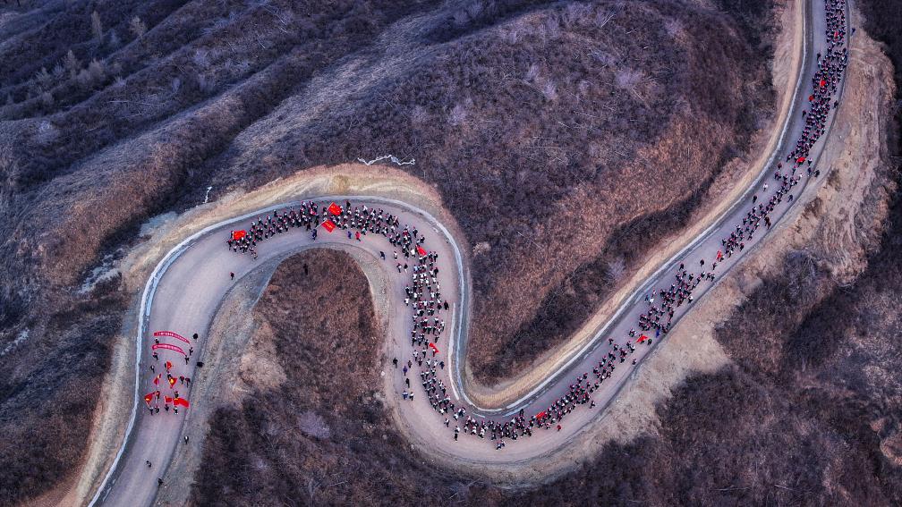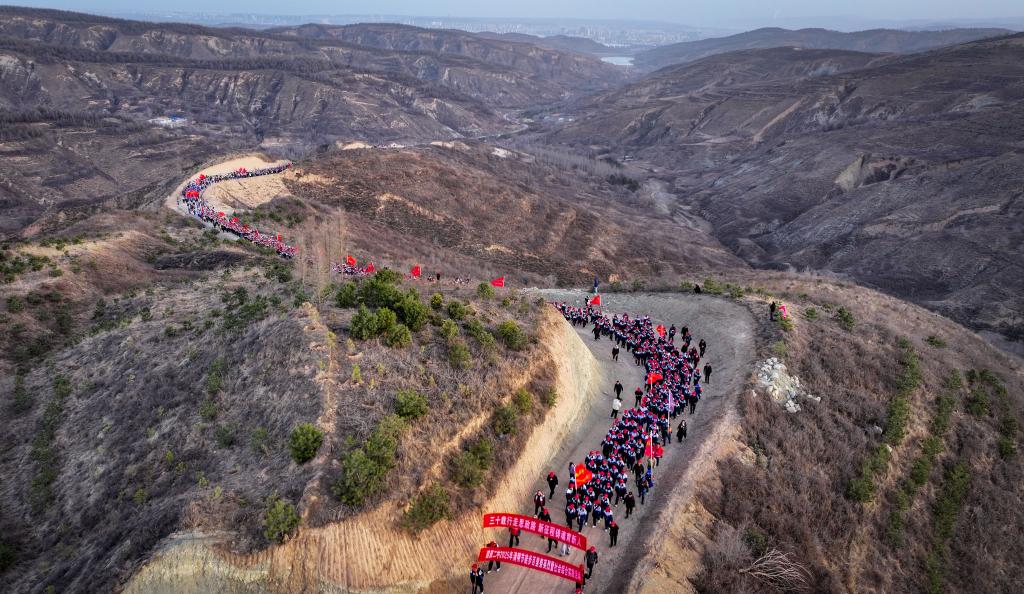4月3日,参加徒步祭英烈活动的师生在翻越黄峁山(无人机照片)。
