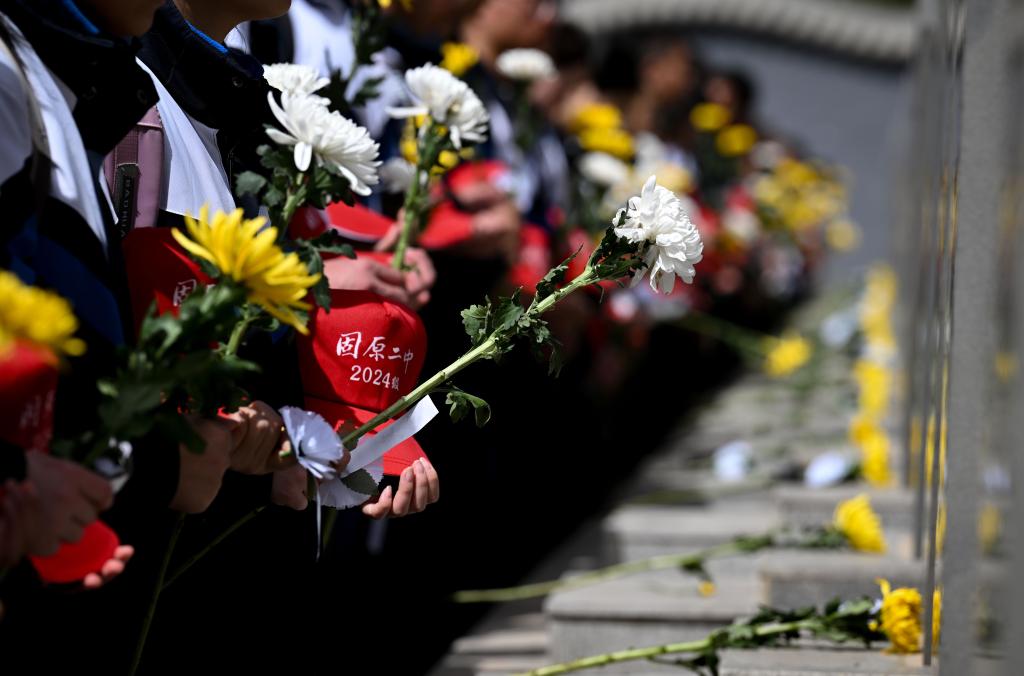 4月3日,抵达任山河烈士陵园的学生们手持白菊原地休整。