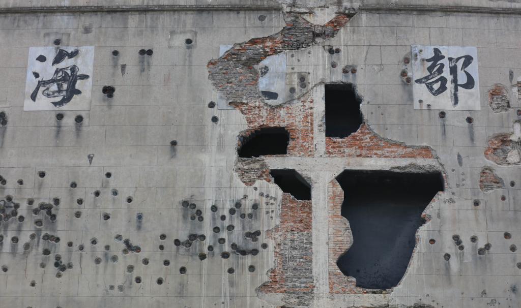 这是四行仓库西墙上的炮弹孔和枪弹孔(2021年9月17日摄)。新华社记者 王翔 摄