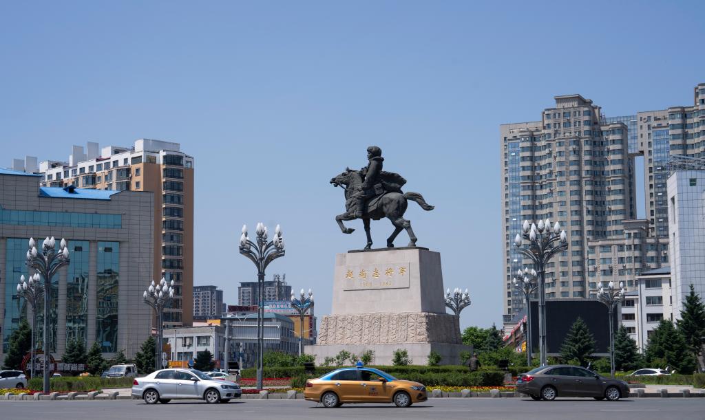 驱车驶入黑龙江省尚志市,一眼便看见环岛中心屹然挺立的高大铜像:赵尚志将军身骑战马,戎装飞扬,他望向远方,好似凝视这一方和平安宁。