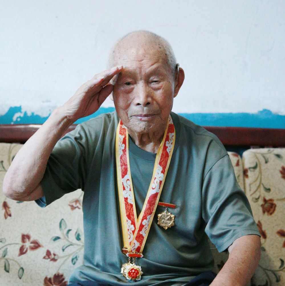 7月24日,96岁的抗日老兵臧海龙在家中展示军礼。新华社记者 肖磊涛 摄