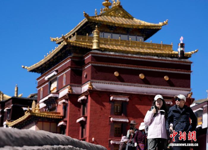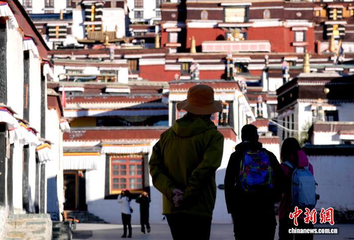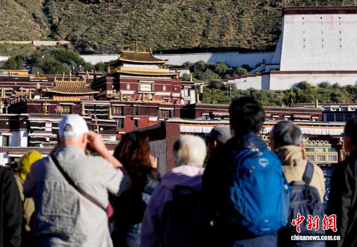10月7日,游客在西藏日喀则市扎什伦布寺参观。扎什伦布寺始建于公元1447年,是中国国家5A级旅游景区。凭借深厚的历史底蕴和独特的文化魅力,吸引众多中外游客参观游览。中新社记者 李林 摄