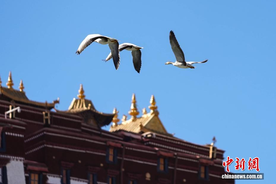 11月17日,西藏拉萨迎来大批越冬候鸟。拉萨河、宗角禄康公园等地,成为了它们的栖息天堂。在宗角禄康公园内,赤麻鸭、斑头雁成群结队,时而低头觅食,时而水中嬉戏。它们的身影引得市民和游客纷纷驻足观赏、拍照留念,构成了一幅人与自然和谐共生的美丽画卷。图为斑头雁从宗角禄康公园上方飞过。贡确 摄