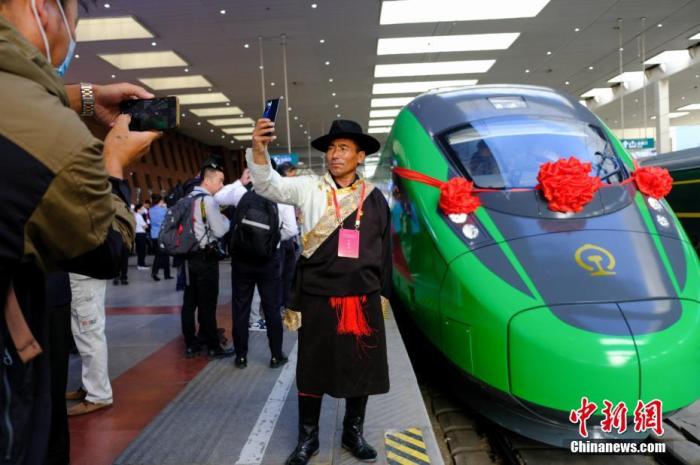 资料图:民众在拉萨火车站复兴号车头前拍照留念。 中新社记者 江飞波 摄