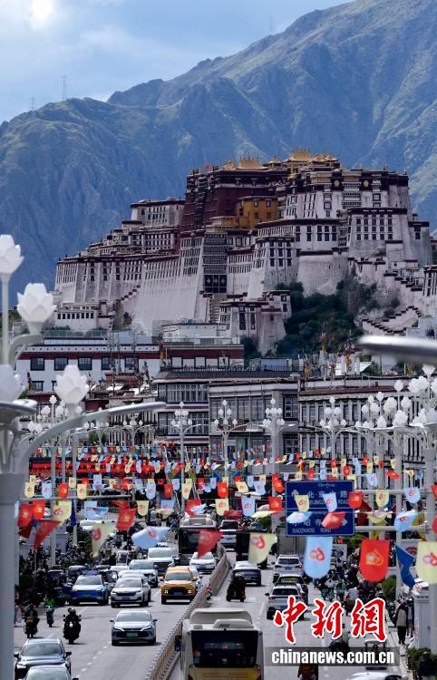 8月19日,随着西藏自治区成立60周年庆祝活动临近,拉萨氛围浓。图为拉萨街头彩旗飘扬。中新社记者 李林 摄