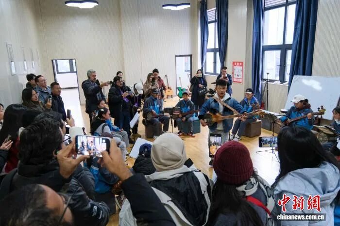10月28日,拉美18个国家的21名记者、编辑等媒体从业者在西藏自治区林芝市巴宜区中学参访,观看师生们演奏藏族扎念琴。 中新社记者 江飞波 摄
