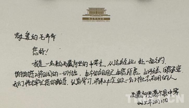 “敬爱的毛爷爷,您好!我是一名来自西藏阿里的中学生。从远方至此,赴一面之约。谢谢您对祖国的一切付出。如今的祖国如您所愿,山河无恙,国泰民安。我们将牢记您的教导,认真学习,将来必定做一名对社会有用的人!”