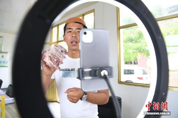 图为张忠山直播售卖羊肉产品。(资料图)杨艳敏 摄