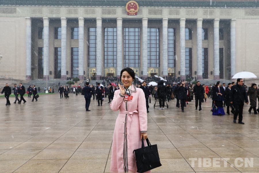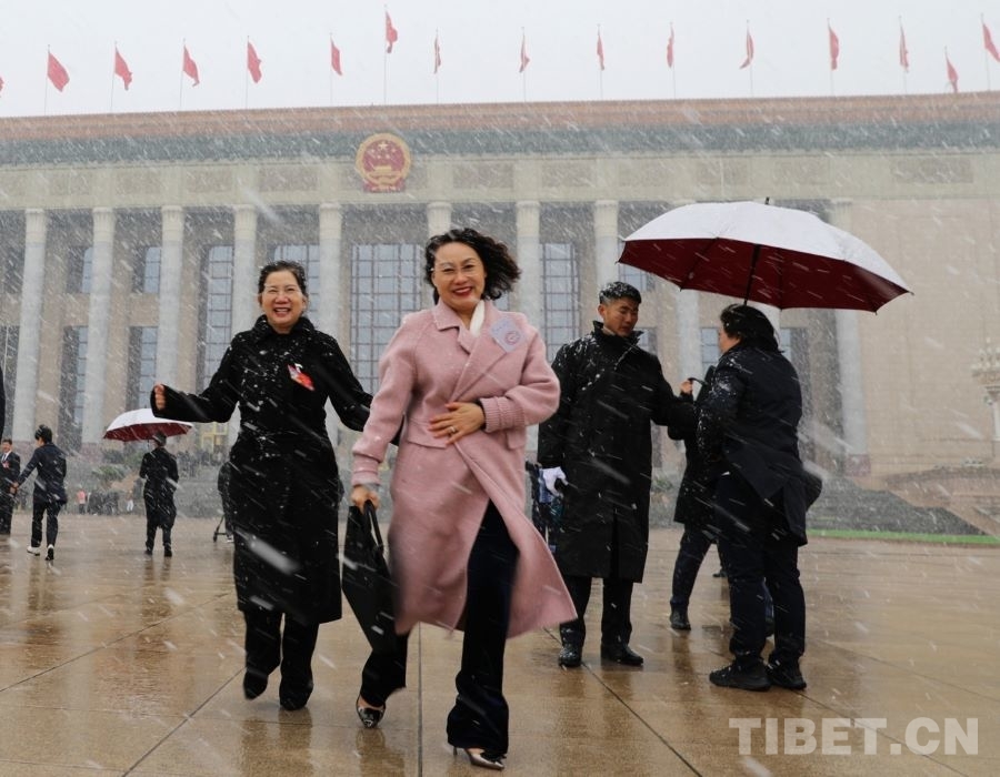3月4日上午,十四届全国人大四次会议举行预备会议。会后,一场春雪不期而至。走出会场的全国人大代表、广西金秀瑶族自治县桐木中学副校长梁丽斌向记者们挥手致意。