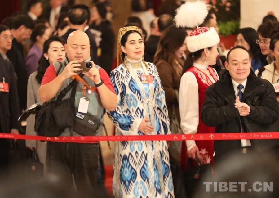 3月5日上午,首场“代表通道”集中采访活动在人民大会堂举行。全国人大代表、新疆维吾尔自治区少数民族古籍保护研究中心副编审米娜瓦尔·艾比布拉(前排左二)旁听代表发言。