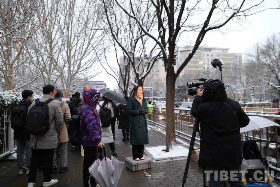 3月5日清晨,记者们在人民大会堂外播报新闻。