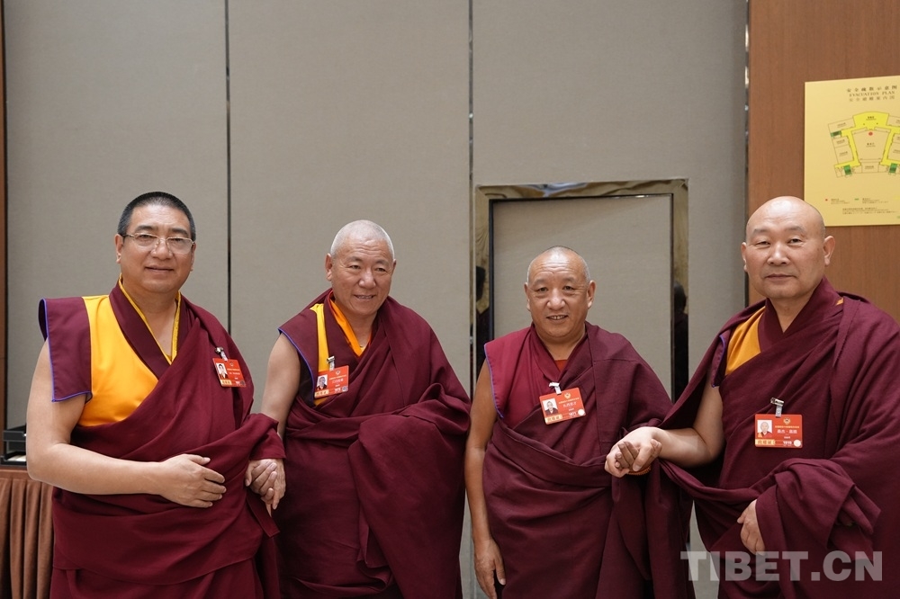两会喜相逢,多位宗教界政协委员在会议间歇合影留念,从左至右分别为:赛赤·确吉洛智嘉措、江白拉桑、扎西坚才、桑杰·嘉措