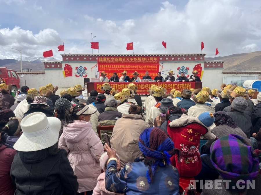 中国西藏网讯 3月28日,西藏日喀则市萨迦县雄麦乡举行纪念西藏民主改革67周年暨2025年度玉麦畜牧养殖农牧民专业合作社分红仪式。