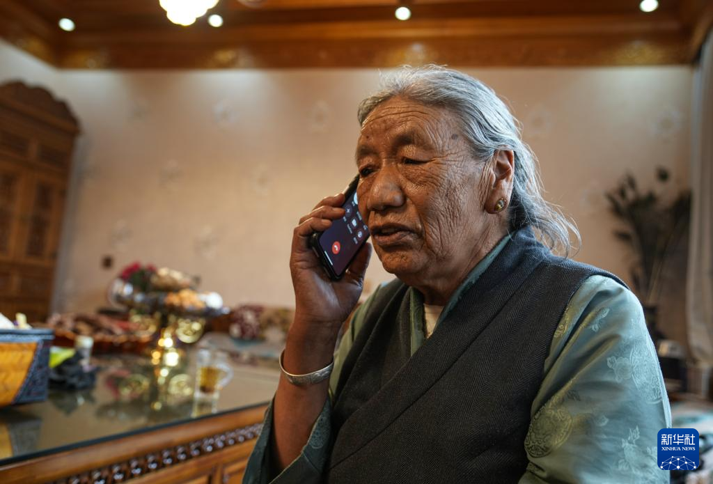 格桑玉珍用手机与好友通话(4月3日摄)。新华社记者 晋美多吉 摄