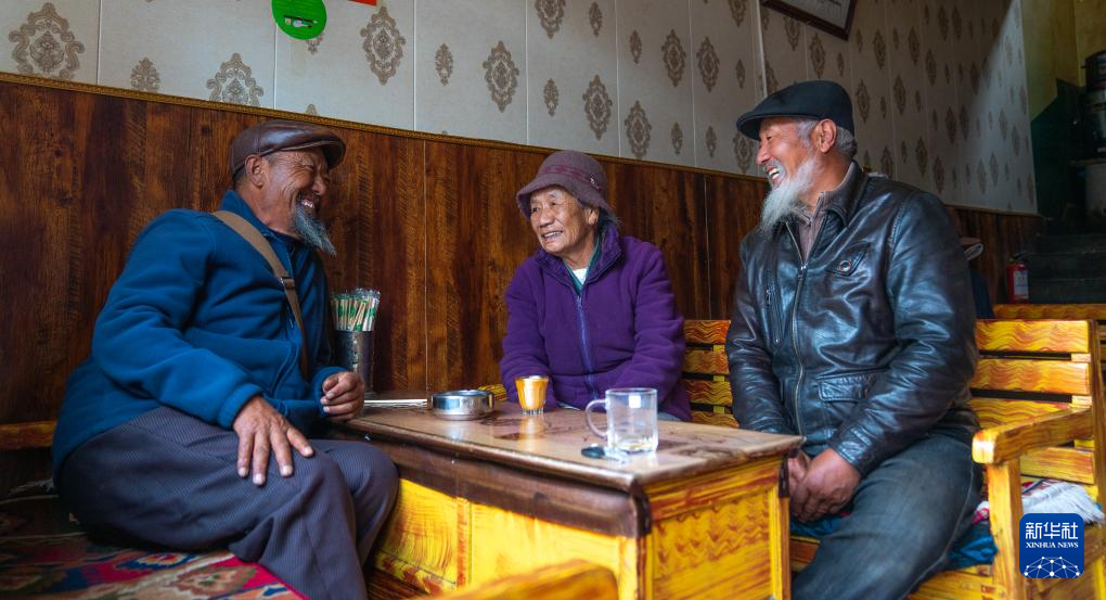 格桑玉珍(中)在茶馆里和好友聊天(4月3日摄)。新华社记者 丁增尼达 摄