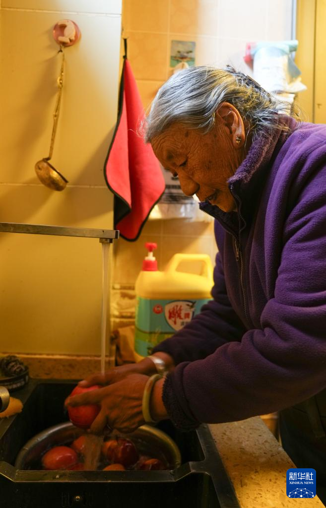 格桑玉珍在家中洗苹果(4月3日摄)。新华社记者 晋美多吉 摄