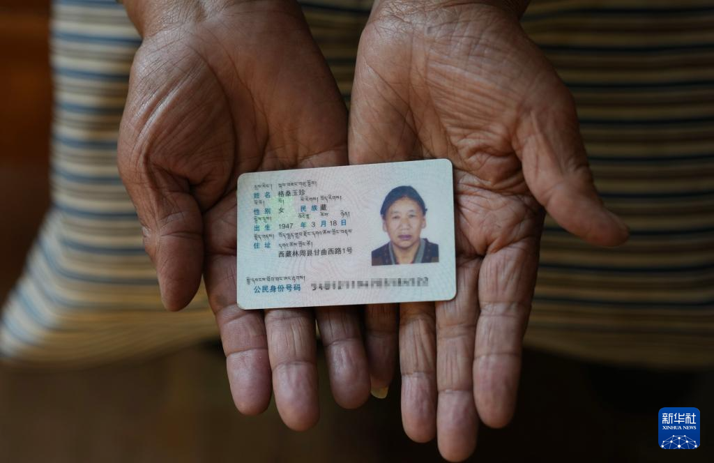 格桑玉珍展示自己的身份证(4月3日摄)。新华社记者 晋美多吉 摄