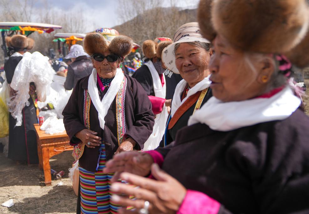 阿旺卓玛(左)在春耕仪式上和乡亲们攀谈(3月16日摄)。
