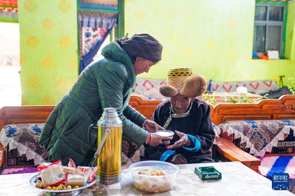 白玛扎西(右)在家中喝酥油茶(3月26日摄)。