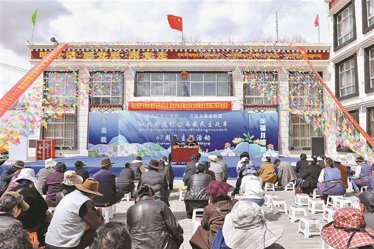 日喀则桑珠孜区城北街道幸福社区开展纪念西藏民主改革67周年宣讲会现场。记者 旦增嘎瓦 摄