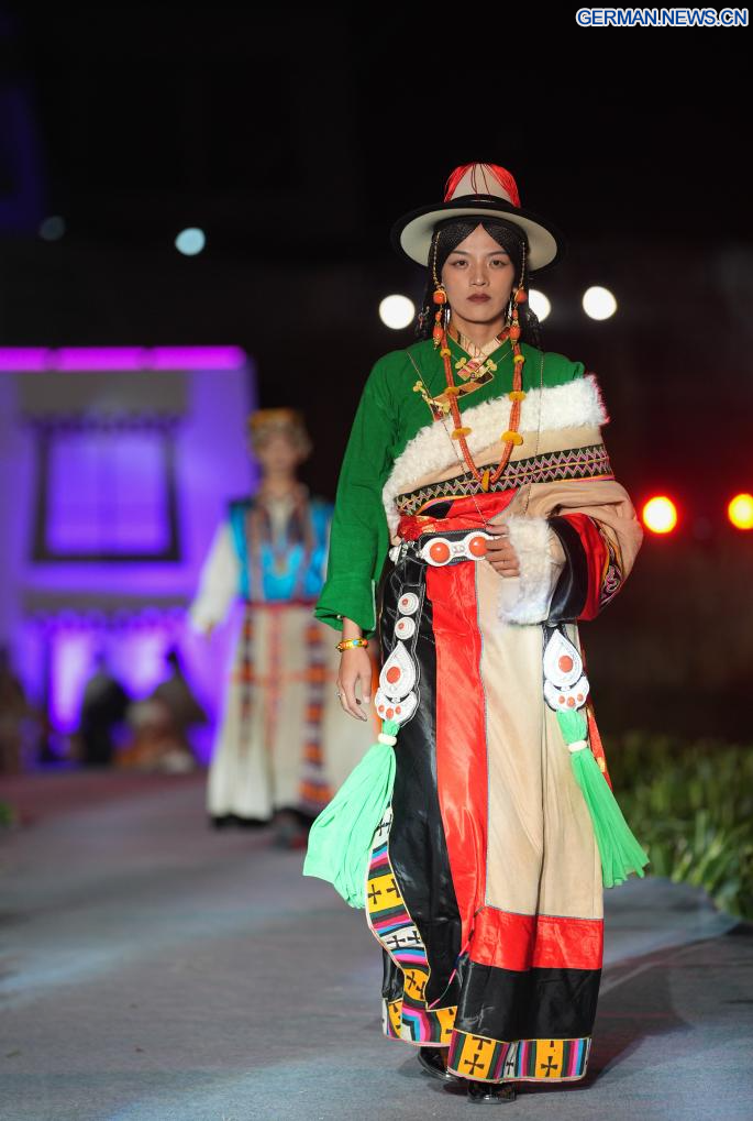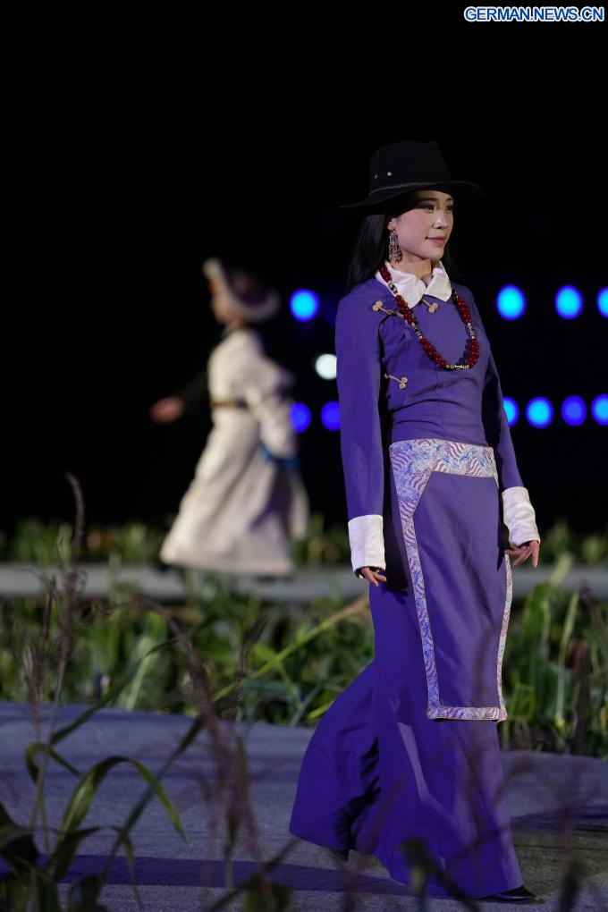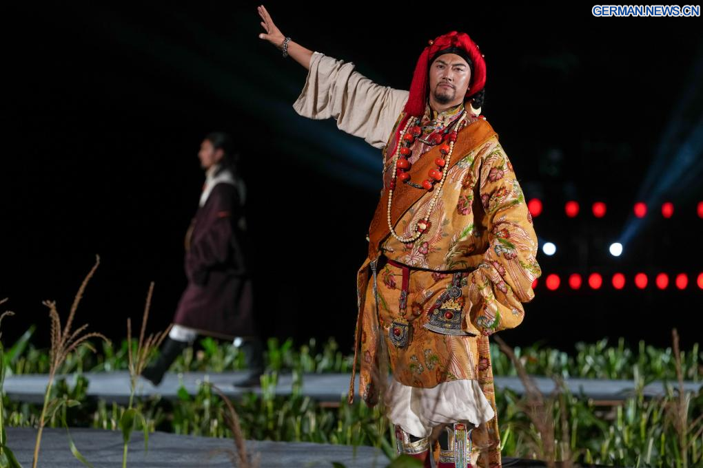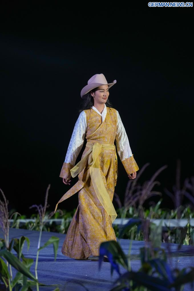 Eine Frau präsentiert traditionelle tibetische Trachten bei einer tibetischen Trachtenvorführung im Dorf Zhongde des Kreises Xiangcheng in der tibetischen Autonomen Präfektur Ganzi in der südwestchinesischen Provinz Sichuan, 20. September 2025. Am Samstag fand hier auf einem Maisfeld eine tibetische Trachtenvorführung statt, die Tradition und Moderne verband.