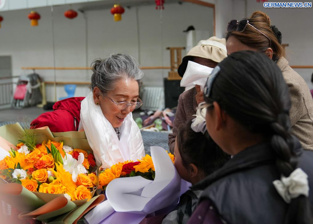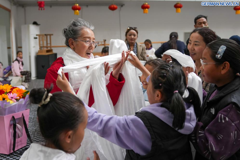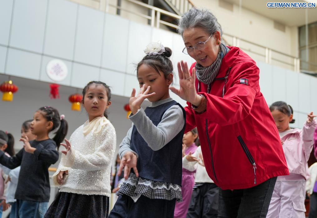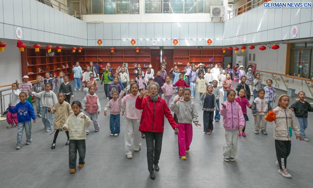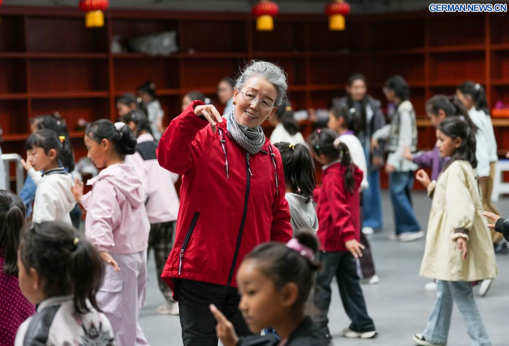 Pasang unterrichtet Kinder in tibetischer Oper im öffentlichen Kunstzentrum in Lhasa im südwestchinesischen Autonomen Gebiet Xizang, 14. September 2025. Pasang, eine nationale Künstlerin erster Klasse und pensioniertes Mitglied der tibetischen Operntruppe des Autonomen Gebiets Xizang, widmet sich seit einem Jahrzehnt freiwillig an ihren Wochenenden der Unterweisung von Kindern in tibetischer Oper.