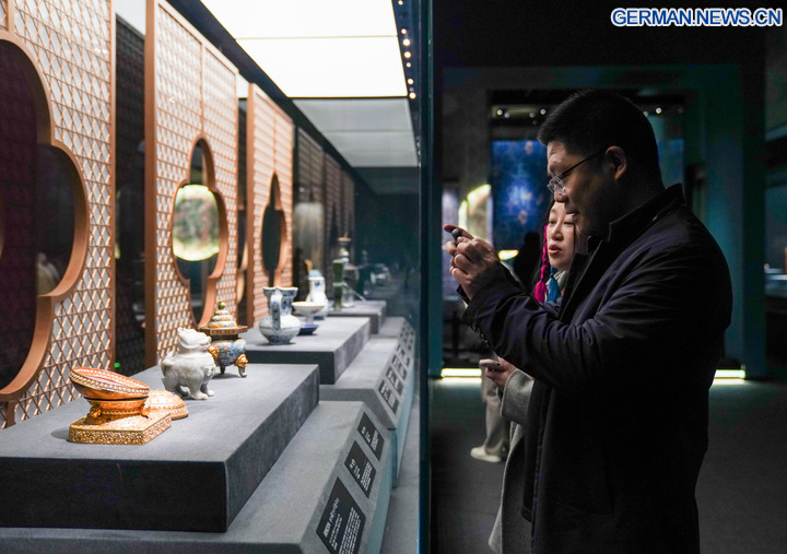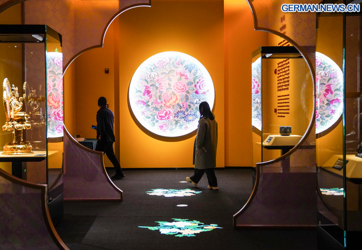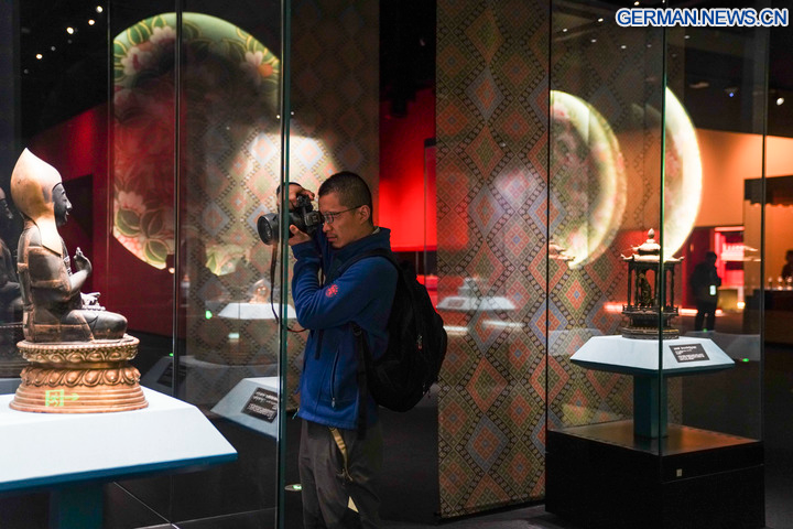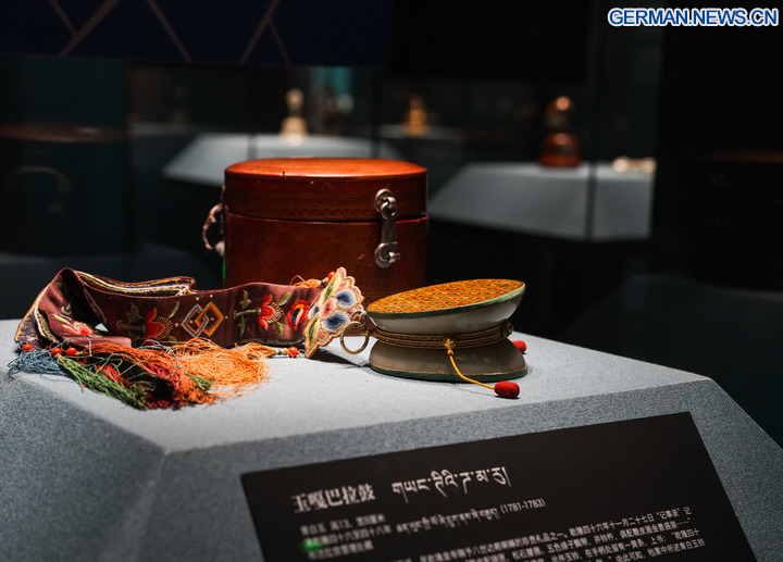 Touristen besuchen eine Ausstellung im Xizang-Museum in Lhasa im Südwesten des autonomen Gebiets Xizang in China, 30. Oktober 2025. Anlässlich des 60. Jahrestags der Gründung des autonomen Gebiets findet in Lhasa eine gemeinsame Ausstellung mit Kulturgütern aus dem Palastmuseum, dem Xizang-Museum, dem Potala-Palast und dem Norbulingka statt. Die Ausstellung dauert bis zum 1. Dezember.