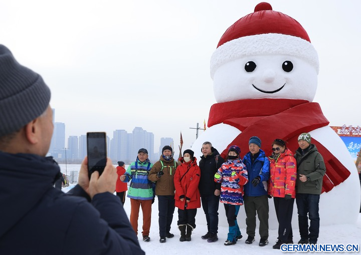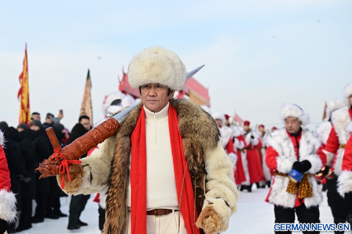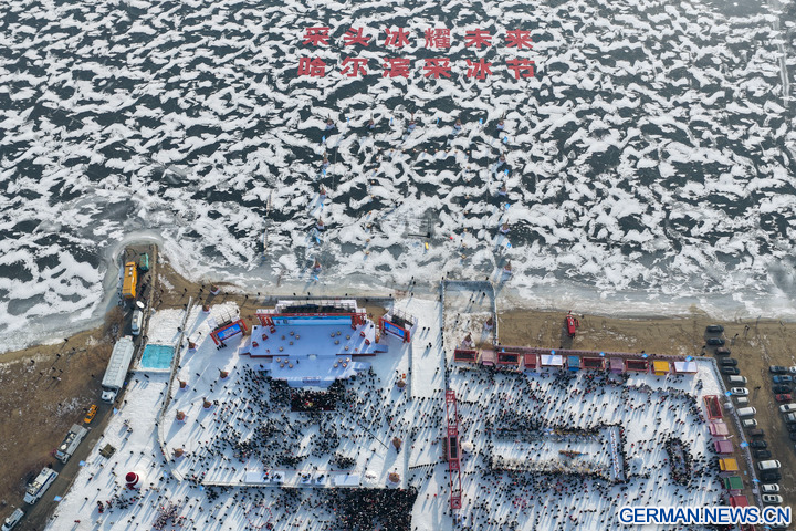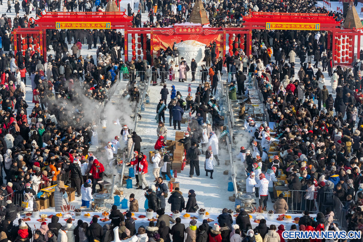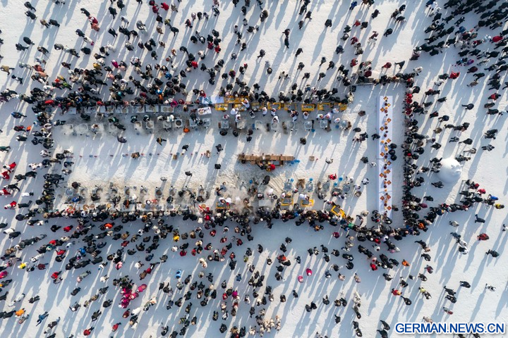 HARBIN, 8. Dezember 2025 (Xinhua) -- Die Luftaufnahme einer Drohne zeigt Menschen beim Probieren von Speisen bei einem Eissammelfest in Harbin in der Provinz Heilongjiang im Nordosten Chinas, 7. Dezember 2025. Das 6. Eissammelfest, das den Beginn der Eissammelsaison in Harbin markiert, begann am Sonntag am Songhua-Fluss und zog mit einer Eissammelzeremonie sowie Aktivitäten zum Kennenlernen von Volksbräuchen viele Menschen an.