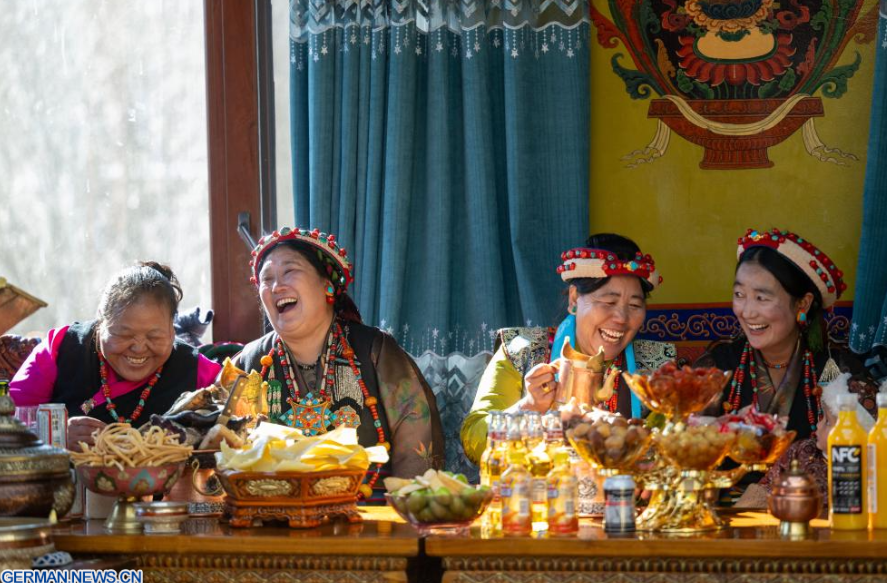 Dorfbewohner werden während einer Feier zum Neujahrsfest der Bauern im Dorf Chusong in der Gemeinde Nyarixung in Xigaze im südwestchinesischen Autonomen Gebiet Xizang abgebildet, 20. Januar 2026. Die lokalen Einwohner in Xigaze feiern das Neujahrsfest der Bauern am ersten Tag des zwölften Monats des tibetischen Kalenders.