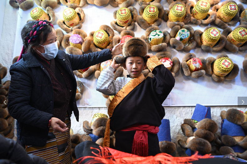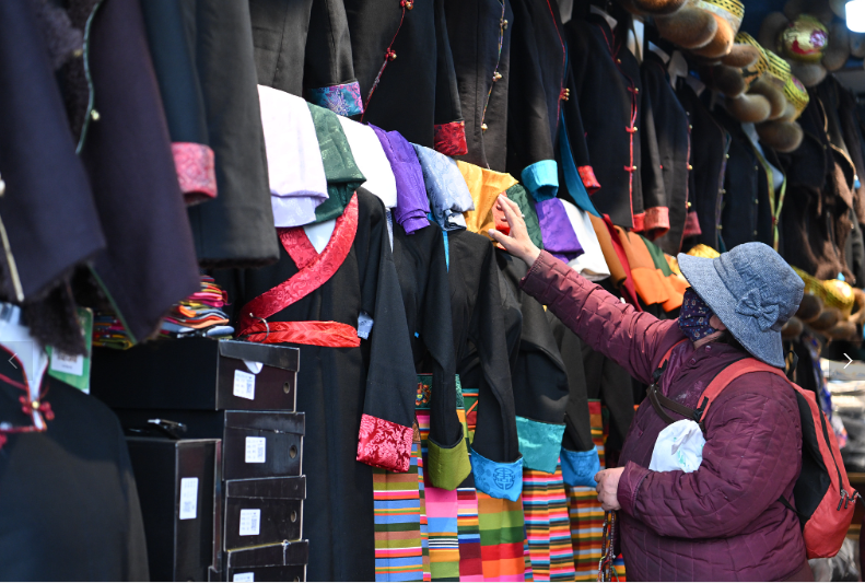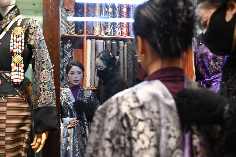 Anlässlich des Neujahrsfests nach dem tibetischen Mondkalender wird die festliche Stimmung in der Stadt Lhasa in Xizang immer lebhafter. Geschäfte, die traditionelle tibetische Kleidung rund um die Barkhor-Straße verkaufen, erleben gerade eine Hochsaison. Die lokalen Einwohner wählen tibetische Kleidungsstücke aus.