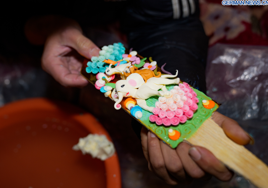 Ein Kunsthandwerker fertigt eine Butterskulptur in Lhasa im Autonomen Gebiet Xizang im Südwesten Chinas, 12. Februar 2026. Butterskulpturen in lebendigen Formen wie beispielsweise Bäumen, Blumen, Vögeln oder Sternen erfreuen sich im Vorfeld zum tibetischen Neujahr auf den Märkten der Stadt zunehmender Beliebtheit.