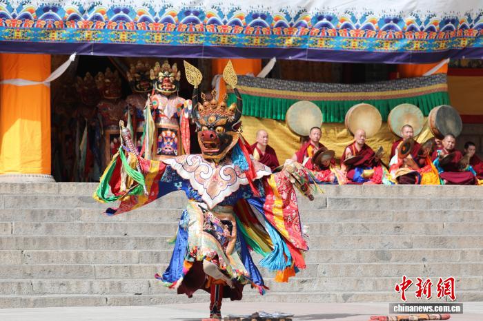 Kürzlich fand im Kreis Huangzhong in Qinghai im berühmten tibetisch-buddhistischen Tempel Kumbum Champa Ling das „Cham“-Ritual statt, um für Weltfrieden sowie für nationalen Wohlstand und Volkswohlstand zu beten. Das Bild zeigt Mönche, die mit Masken auftreten.