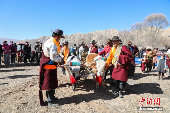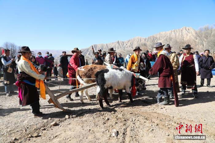 Kürzlich kamen in Guide der Provinz Qinghai Menschen in festlicher Kleidung mit Frühlingsbestellungs-Brot (auf Tibetisch „Tonggao“ genannt) auf die Felder, um mit der traditionellen Methode „Zwei Ochsen und eine Schulterstange“ die „erste Furche“ der Frühlingsbestellung zu ziehen und so die Hoffnung auf Frieden im Land, Wohlstand für das Volk, günstiges Wetter und reiche Ernten auszudrücken. Das Bild zeigt Menschen, die die „erste Furche“ der Frühlingsbestellung ziehen.