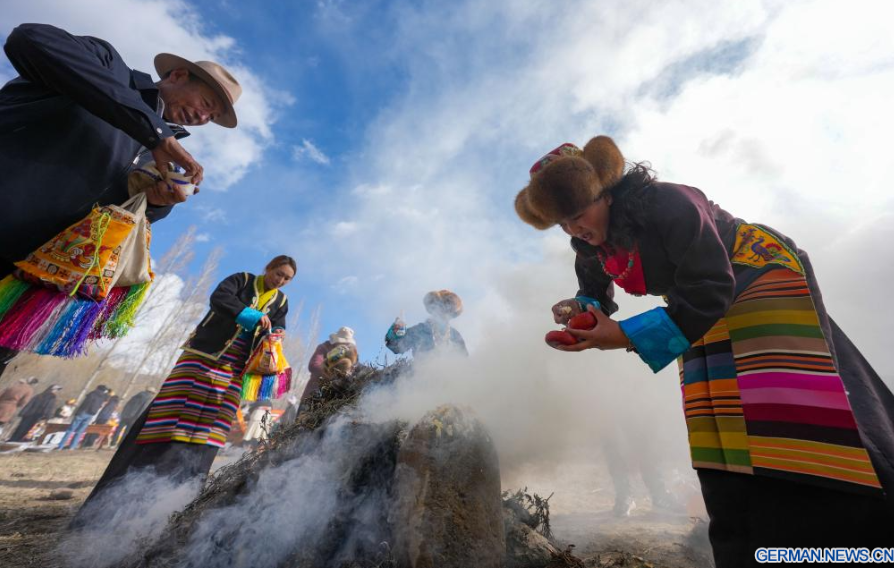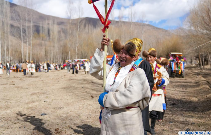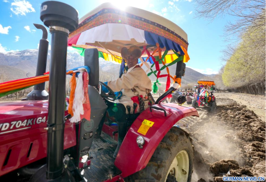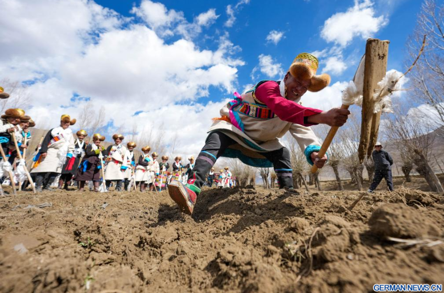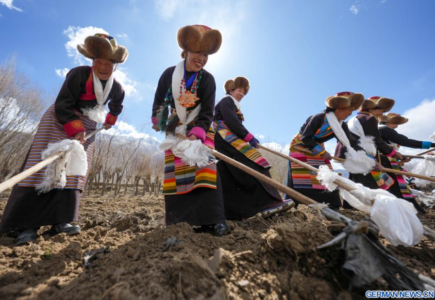 Dorfbewohnerinnen in traditioneller Tracht nehmen im Dorf Gaiba in der Stadt Shannan im südwestchinesischen Autonomen Gebiet Xizang an einer Zeremonie zum Beginn der Frühjahrsbestellung teil, 16. März 2026. Die Zeremonien zum Beginn der Frühjahrsbestellung fanden am Montag in ganz Xizang statt. Diese Zeremonie ist von großer Bedeutung, da sie den Beginn der neuen Landwirtschaftssaison markiert und als Gebet für gutes Wetter und reiche Ernten dient. Sie gilt als wichtiges Ritual in den landwirtschaftlichen Regionen Xizangs. Über 200 Dorfbewohner in traditioneller Tracht nahmen an der Zeremonie im Dorf Gaiba in Shannan teil.
